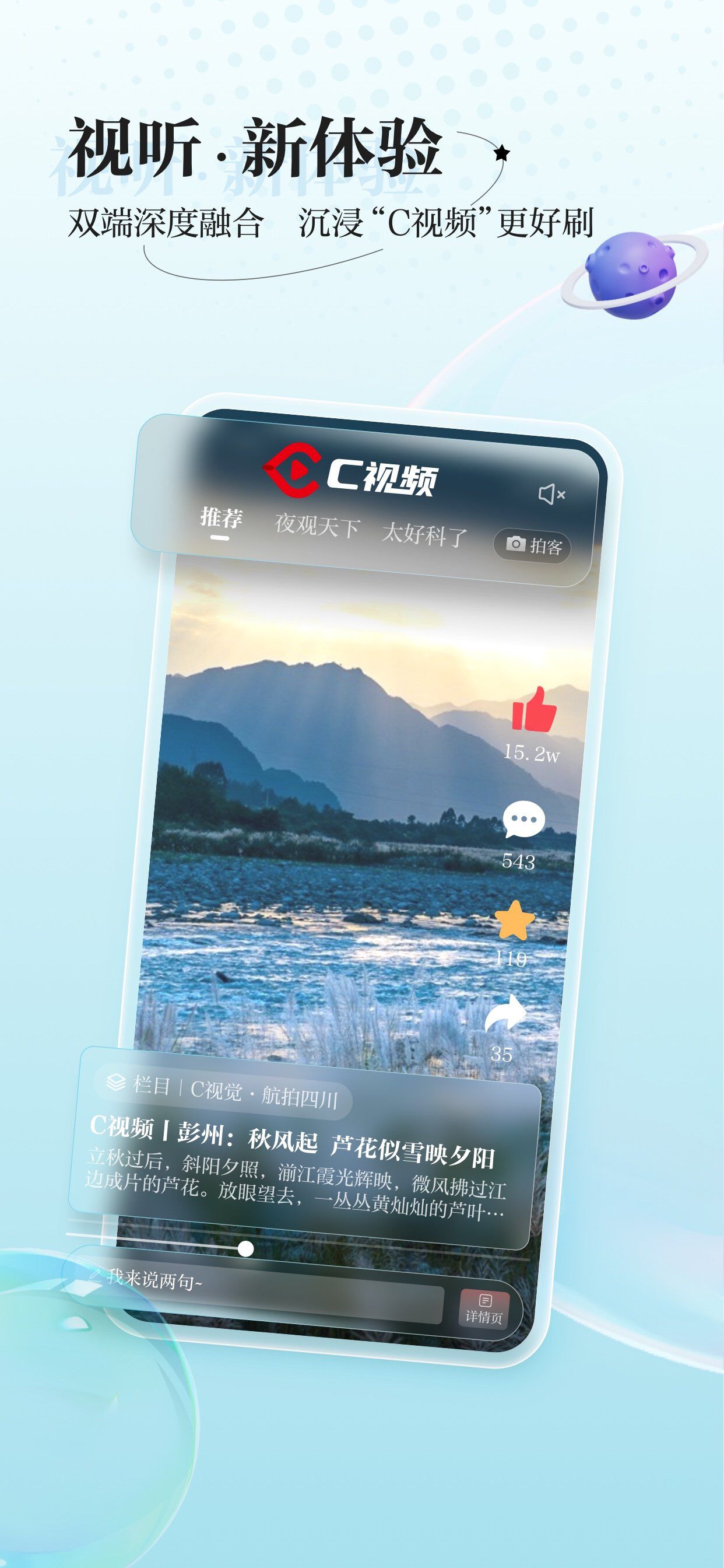 “C视频”客户端以全屏视频的形式呈现,更贴合用户习惯,提供了沉浸式观感与年轻态交互。用户上下滑动即可切换视频,还可一键点赞、转发、评论,在轻松、便捷的视听体验中“看四川,观天下”。