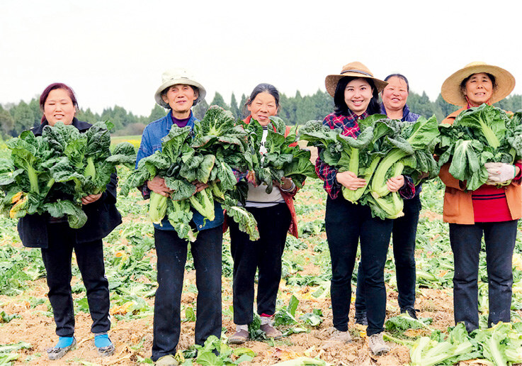 周俊英(右三)和虎跳镇陈江村菜农一同采收青菜 。图/张林