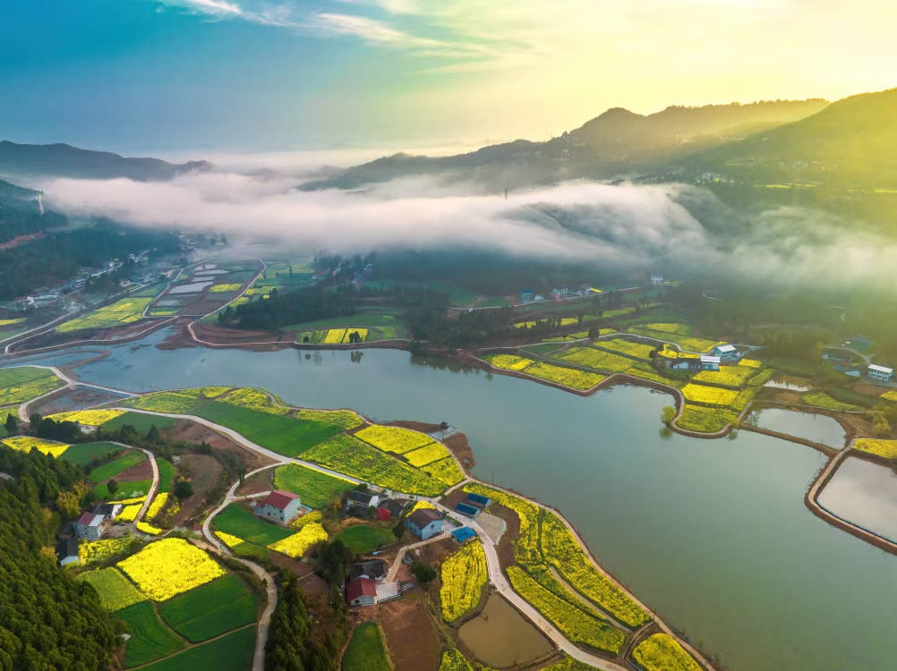 吹苑野风桃叶碧,压畦春露菜花黄。在杨村镇官店村,上千亩油菜花田在阳光的映衬下格外“亮眼”,绕着长湖水库一路驶去,花海、果园、民宿、稻鱼综合体尽收眼底。在这条3公里长的游线里,游客可以看尽剑南乡村蓬勃而起的“绿富美”新业态。