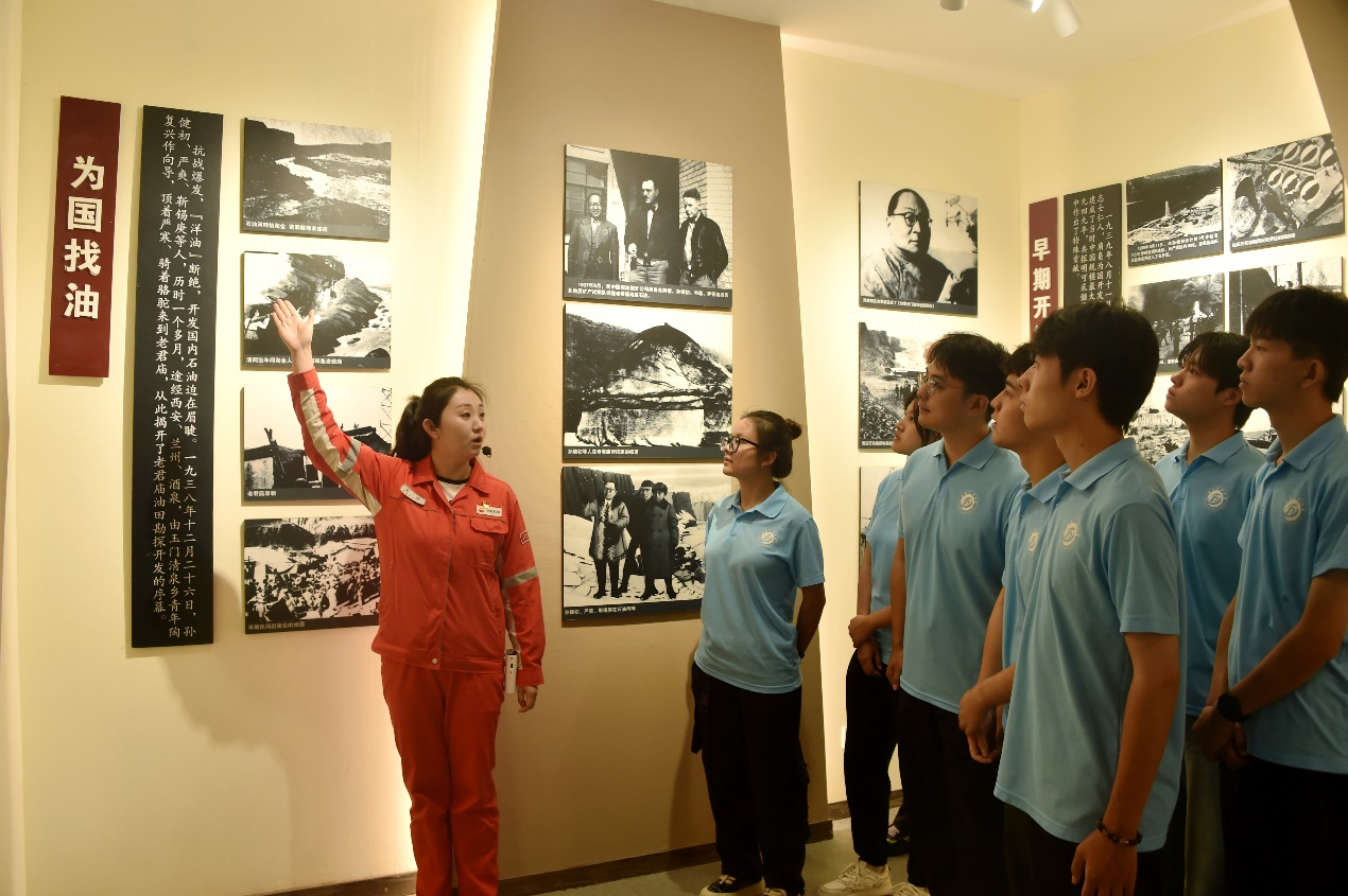 在老君庙油矿旧址,师生们伫立在中国第一口油井“老一井”碑记前,静静聆听抗战时期严爽、孙健初、靳锡庚等先辈顶风冒雪勘探的故事。凛冽寒风中先辈们踏遍戈壁的身影仿佛就在眼前,师生们纷纷感慨:“这场寻根之旅让我们真正触摸到了中国石油工业的精神源头,加深了对‘为祖国加油、为民族争气’的大学精神的理解和认识。”