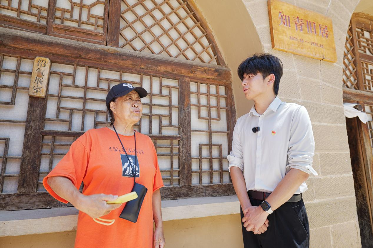 实践队员在梁家河村知青旧居前和当年与习近平总书记一起插过队的知青交流