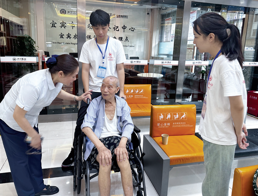 宜宾农商银行营业部工作人员带领大学生志愿者为残疾老人提供金融咨询服务。供图/省委金融工委
