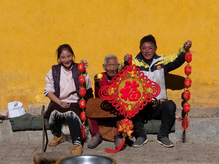 96岁高龄的西饶老大爷手捧着第一张全家福神情庄重,他用布满老茧的手指反复地摩挲着相纸,仿佛抚摸一段珍贵的记忆,浑浊的眼眸中泛起了晶莹的泪光。他用颤抖的声音说:“我这一辈子当过奴隶干过苦工,吃过好多苦。新中国成立后日子一天比一天好。这是我的第一张全家福,谢谢你们帮我圆了梦!”