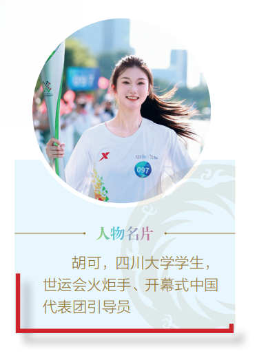 7月26日下午,第97棒火炬手胡可面带微笑奔跑在兴隆湖环湖绿道,手握微微发烫的火炬柄,耳畔传来志愿者热烈的“加油”声;几个小时后的彩排,她换上一身庄重礼服,将引导牌稳稳举在胸前,引导中国代表团昂首步入成都世运会开幕式会场……既是火炬手,又是开幕式中国代表团引导员,双重的身份,不仅给胡可带来了双重的喜悦,也带来了双重的责任与挑战。
