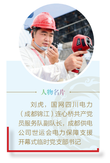 作为国网四川电力成都连心桥共产党员服务队的10名保电队员之一,刘虎和队友们承担着本届世运会开闭幕式的电力保障任务。