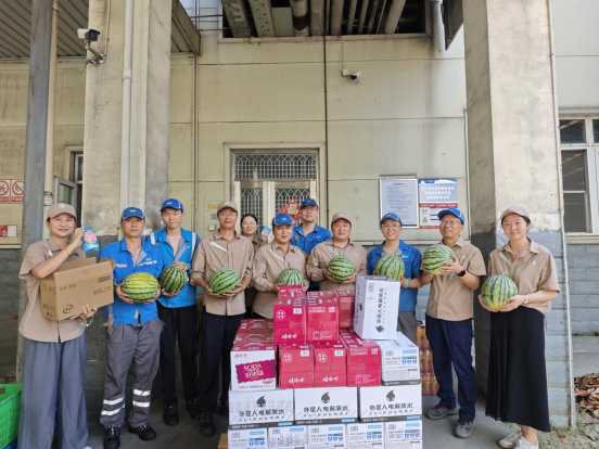 6月16日午后,烈日当空,工厂党支部书记李崇明、工会主席宋晓辉分组带领党员、青年志愿者,扛着沉甸甸的西瓜、拎着成箱的冰棍和饮料,直奔营运现场、车间等部门,将冰镇物资送到员工手中,并反复叮嘱防暑注意事项;8月上旬持续高温天,同样的身影又出现在厂区各个现场,冰爽的饮品与暖心的叮嘱交织,让闷热的车间里漾起阵阵清凉。