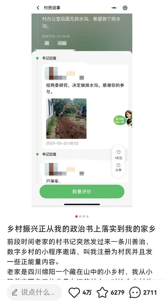 令人印象深刻的是,在这个平台上,小到“苞谷旱坏了”“老屋有个马蜂窝”这样的邻里小事,大到办证明、领补贴等公共服务,村民只要发帖,很快就能得到回应。每条动态背后,都有村干部的及时回复和跟进过程,处理结果也以图片的形式反馈。这些日常互动,让乡村治理不再是一个抽象概念,而是成了可对话、可参与、可监督的日常实践。