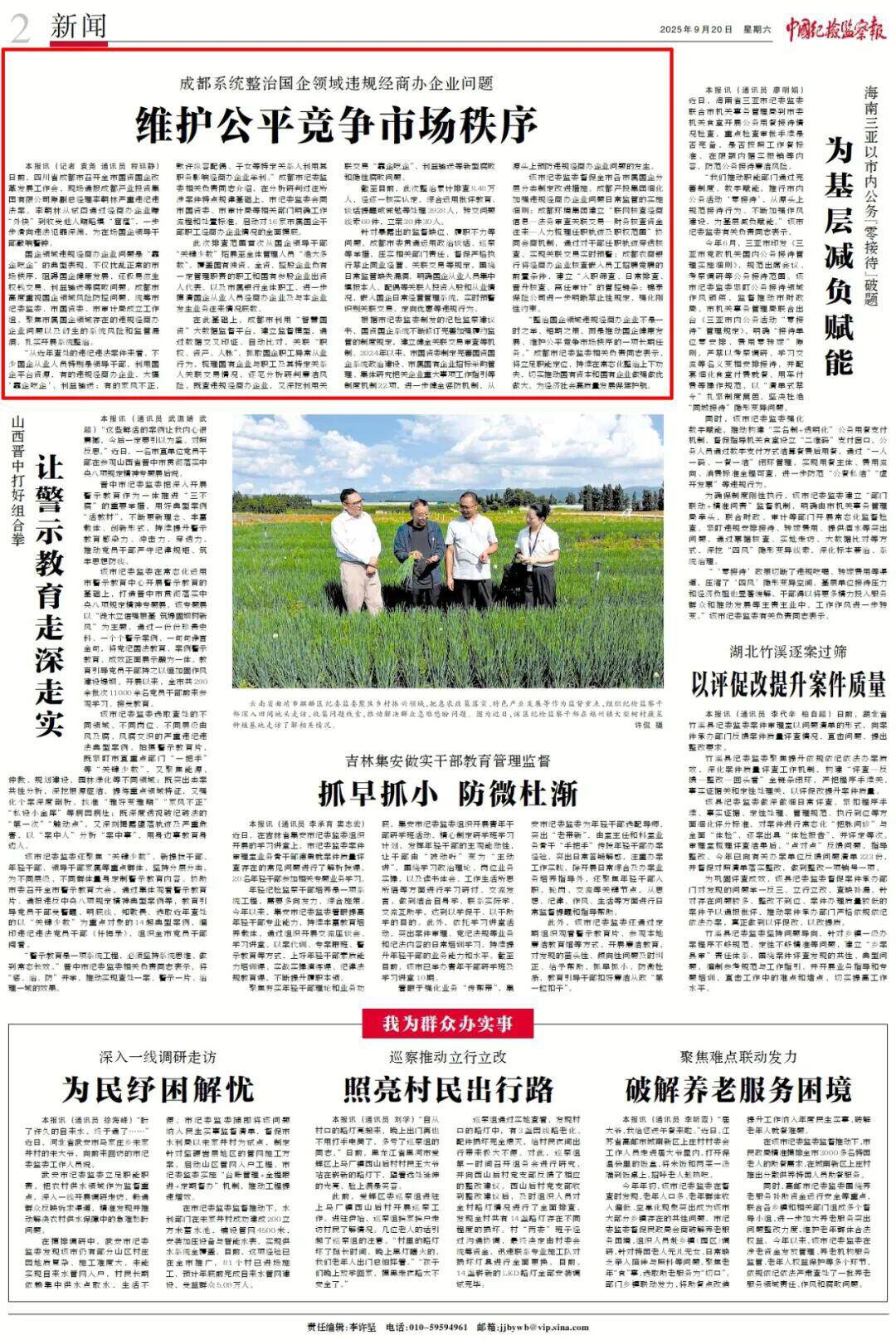 9月20日,中国纪检监察报“新闻”版刊发报道《成都系统整治国企领域违规经商办企业问题 维护公平竞争市场秩序》,关注成都聚焦市属国企领域存在的违规经商办企业问题以及衍生的系统风险和监管漏洞,扎实开展系统整治的实践。中央纪委国家监委网站、客户端同步刊发。