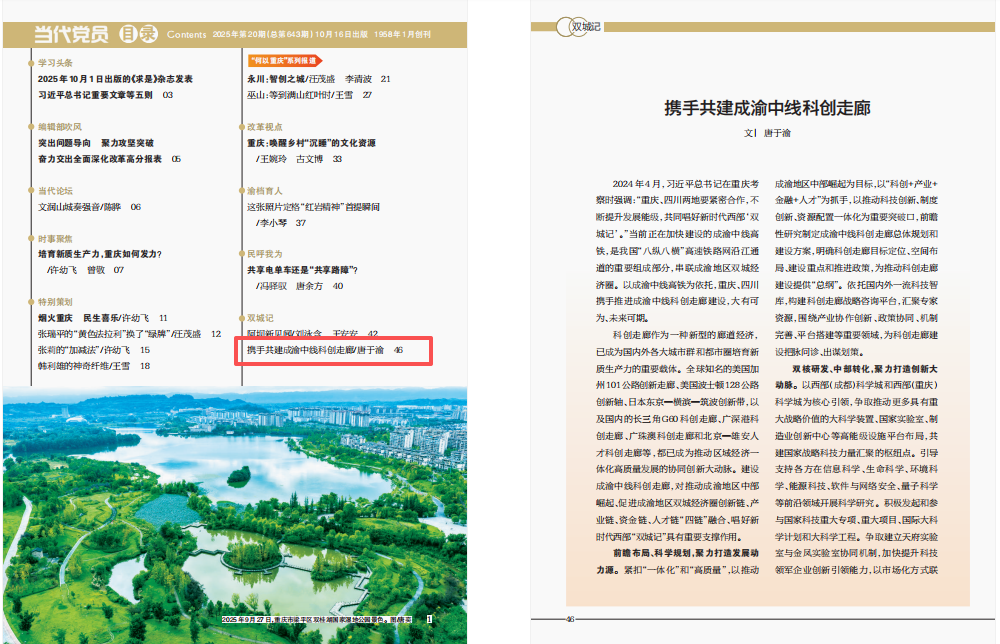 2024年4月,习近平总书记在重庆考察时强调:“重庆、四川两地要紧密合作,不断提升发展能级,共同唱好新时代西部‘双城记’。”当前正在加快建设的成渝中线高铁,是我国“八纵八横”高速铁路网沿江通道的重要组成部分,串联成渝地区双城经济圈。以成渝中线高铁为依托,重庆、四川携手推进成渝中线科创走廊建设,大有可为、未来可期。