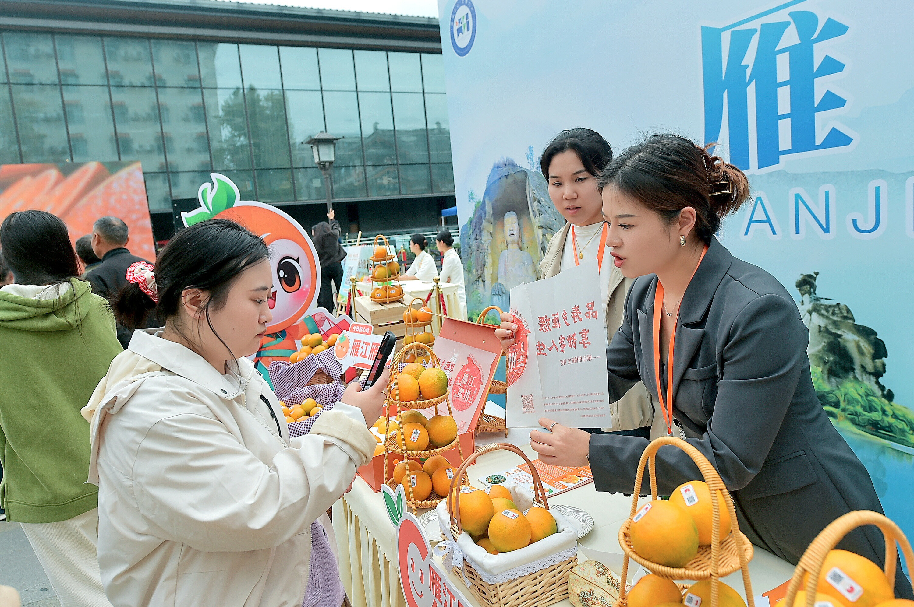 下午3时,伴随原创舞蹈《橘子红了》的欢快旋律,活动正式拉开帷幕。雁江区文艺团体以明亮服饰与丰收主题编排,迅速点燃现场气氛,这一抹“爱马仕橙”吸引众多游客驻足。在农产品推介环节,雁江区长寿柑桔协会会长杨勇重点介绍了雁江蜜柑系列产品,并聚焦新品种“雁媛”的独特优势展开详解。