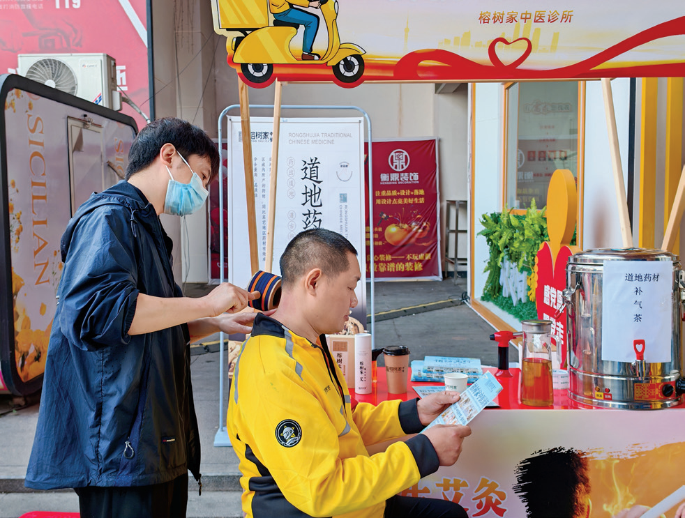 栖西里商圈爱心商家为外卖骑手免费提供理疗服务。供图/中共仁寿县委社会工作部