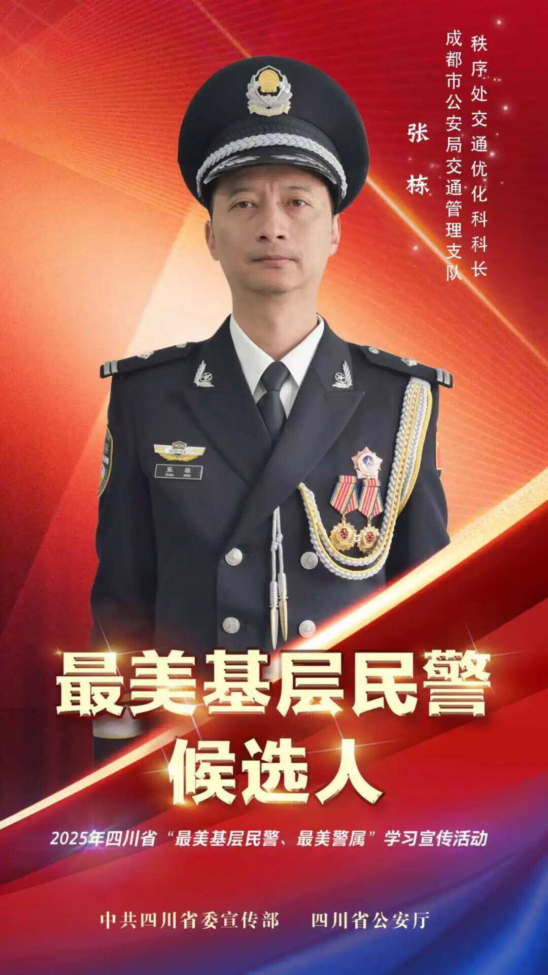 张栋,男,汉族,1984年1月出生,中共党员,研究生学历,现任成都市公安局交通管理局秩序处交通优化科科长。先后荣立个人三等功3次、个人嘉奖7次、“优秀共产党员”5次,2024年12月被成都市总工会授予“成都市五一劳动奖章”。