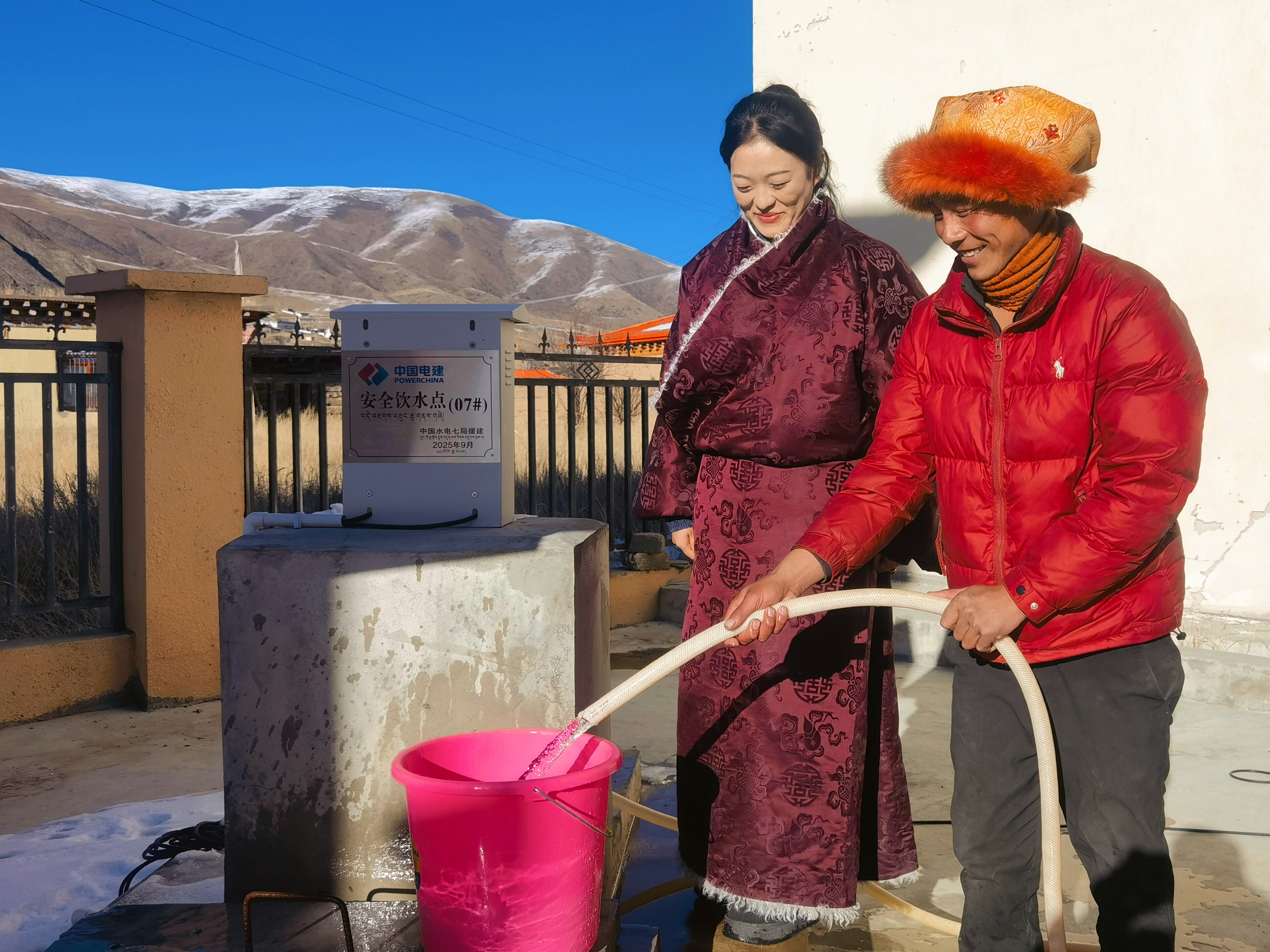 轻轻向下按开关,“哗啦”一声,清澈的水柱喷涌而出,在高原阳光下闪着银光。人群爆发出“呀波都!(太好了)”的欢呼声,老人们竖起了大拇指,年轻的姑娘小伙们露出了灿烂的笑容。