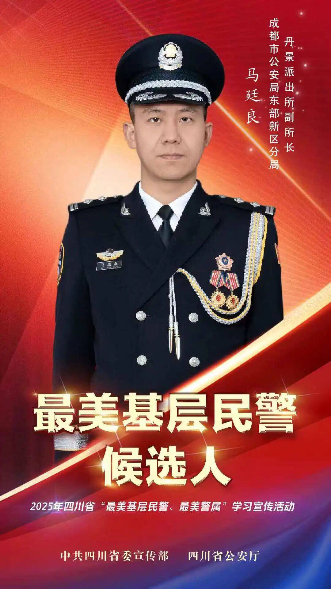 马廷良,男,38岁,汉族,现任成都市公安局东部新区分局丹景派出所副所长,曾荣获“个人二等功”1次、“个人三等功”3次、“抗震救灾先进个人”、市局“个人嘉奖”6次、“优秀共产党员”2次、成都市两优一先“优秀党务工作者”1次。