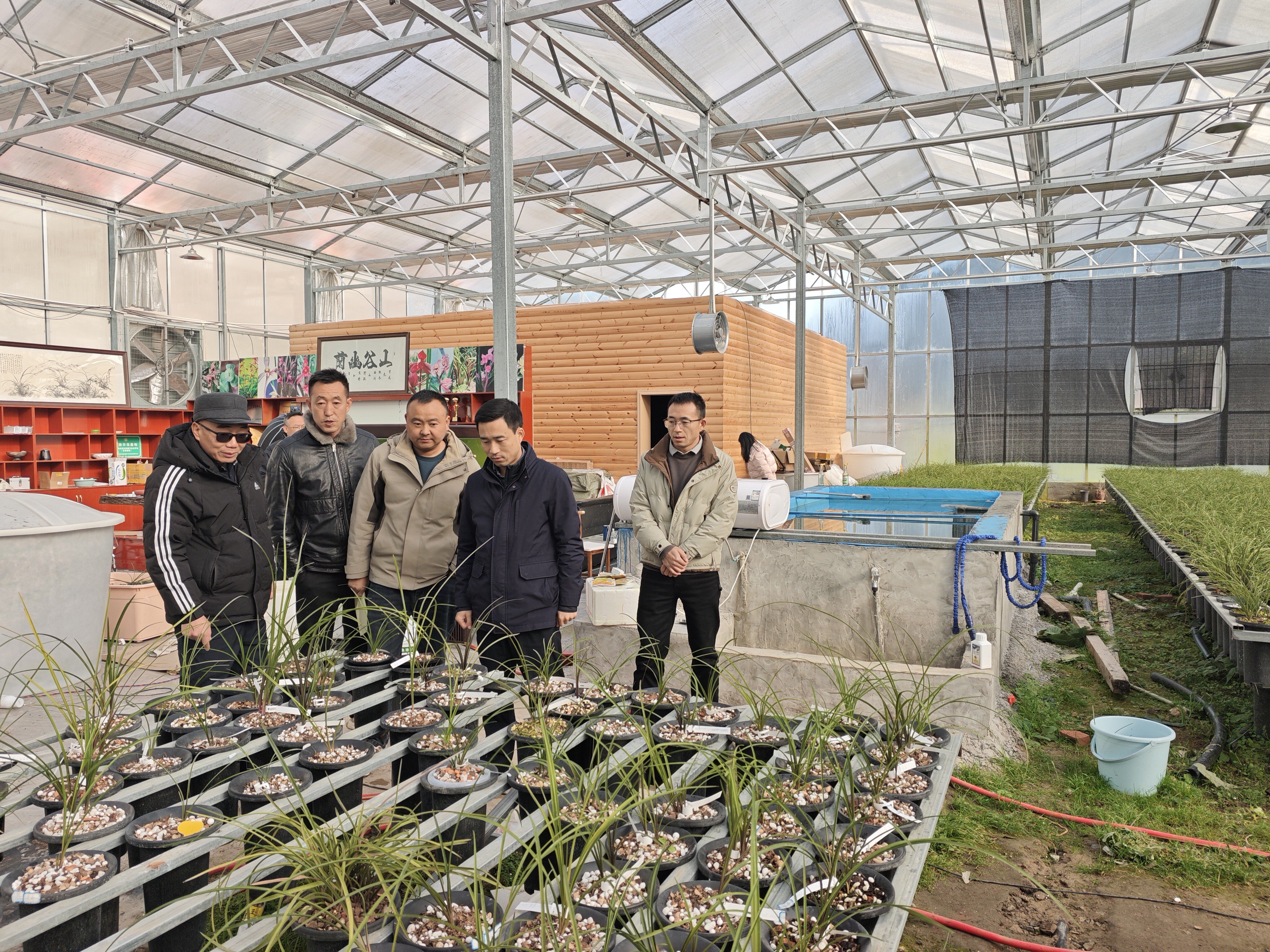 彭智力(右二)在九寨沟县勿角镇同兴种植专业合作社调研兰草产业发展情况。