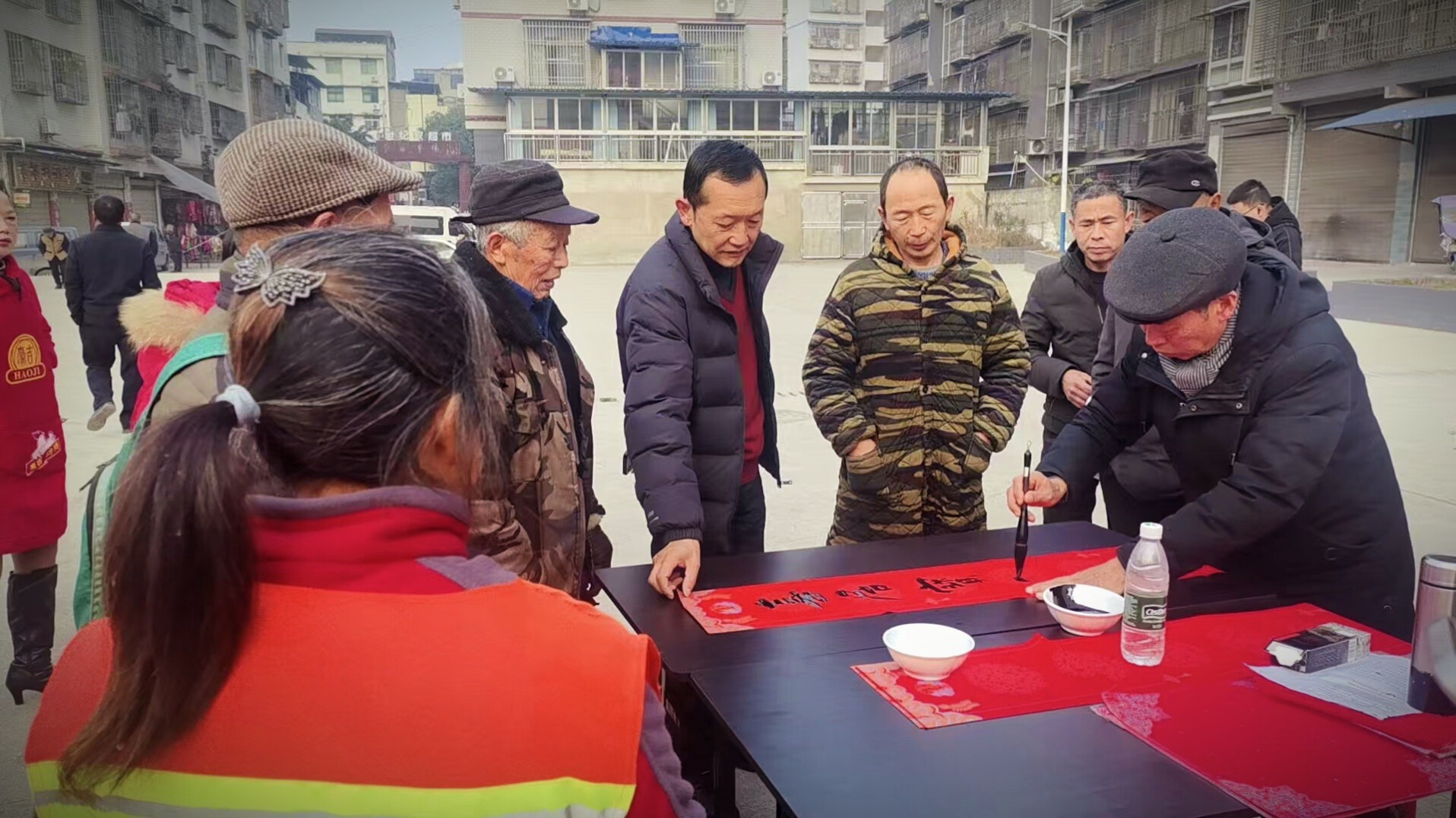 演出间隙,写春联送福字活动同步开展。书法爱好者们挥毫泼墨,将一副副寓意吉祥的春联和一个个喜庆的“福”字送到群众手中,大家捧着红彤彤的春联,脸上洋溢着幸福的笑容。