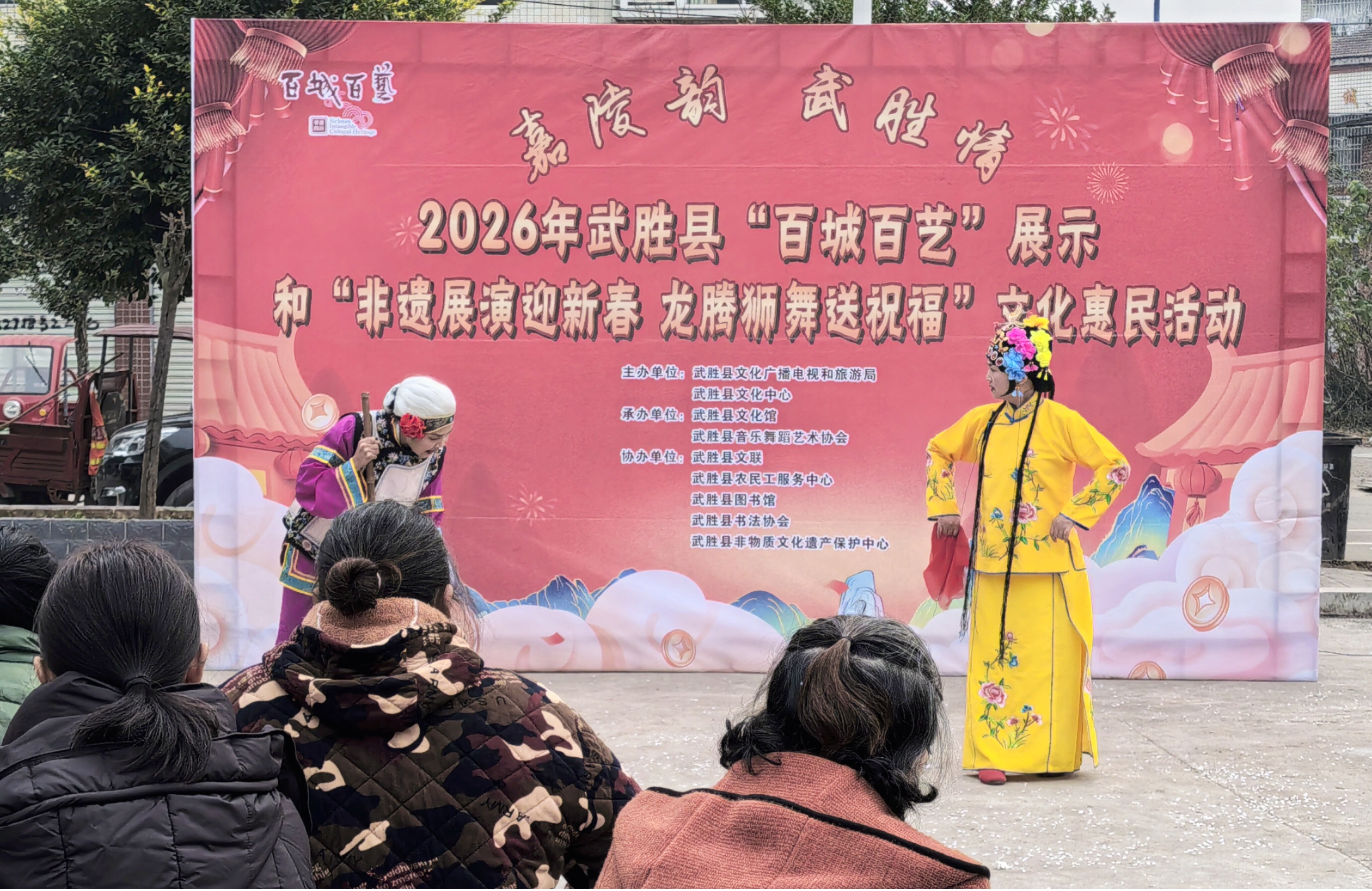 为丰富群众精神文化生活,营造欢乐祥和的新春氛围,1月14日,由武胜县文广旅局和文化中心主办的2026年武胜县“百城百艺”展示和“非遗展演迎新春 龙腾狮舞送祝福”文化惠民活动在万善镇万渝路社区文体广场热闹开场。