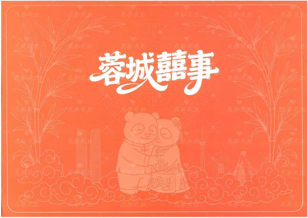 婚书背面,以成都地标为骨、翠竹祥云为脉,将相拥的熊猫藏于其间作为暗纹铺陈,环绕着居于正中的喜字与“蓉城囍事”,寓意良缘天定、琴瑟和鸣。