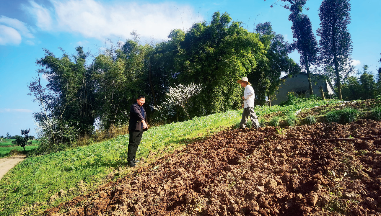 唐阳(左)正在跟种植户交流春耕事宜。