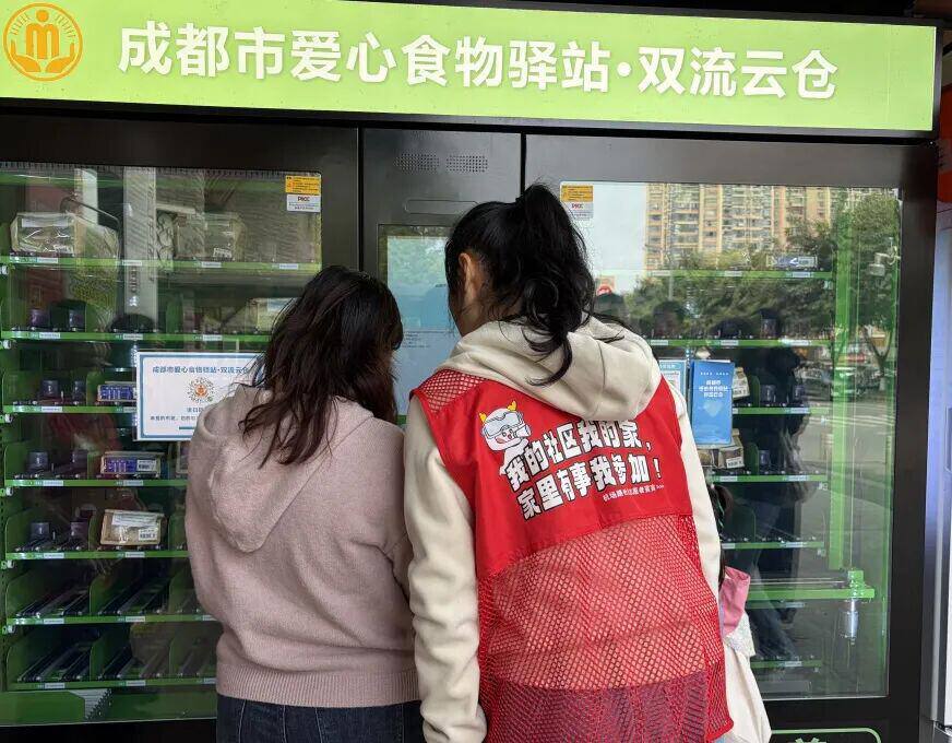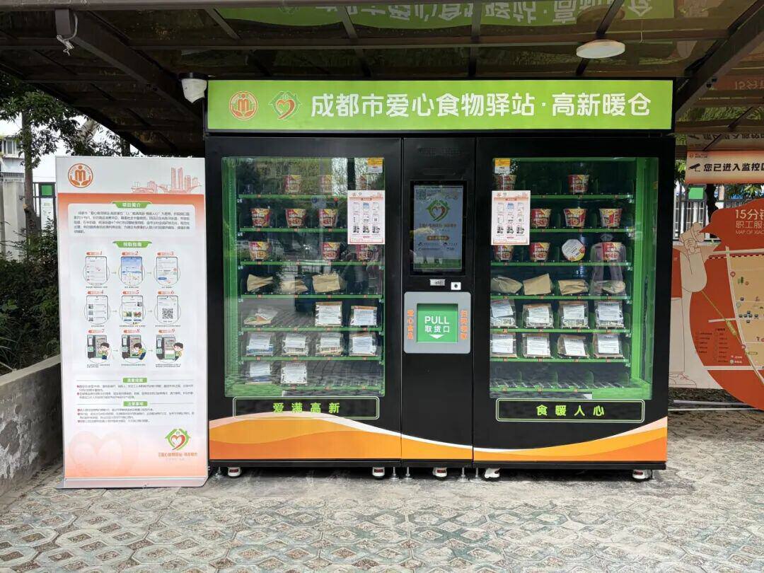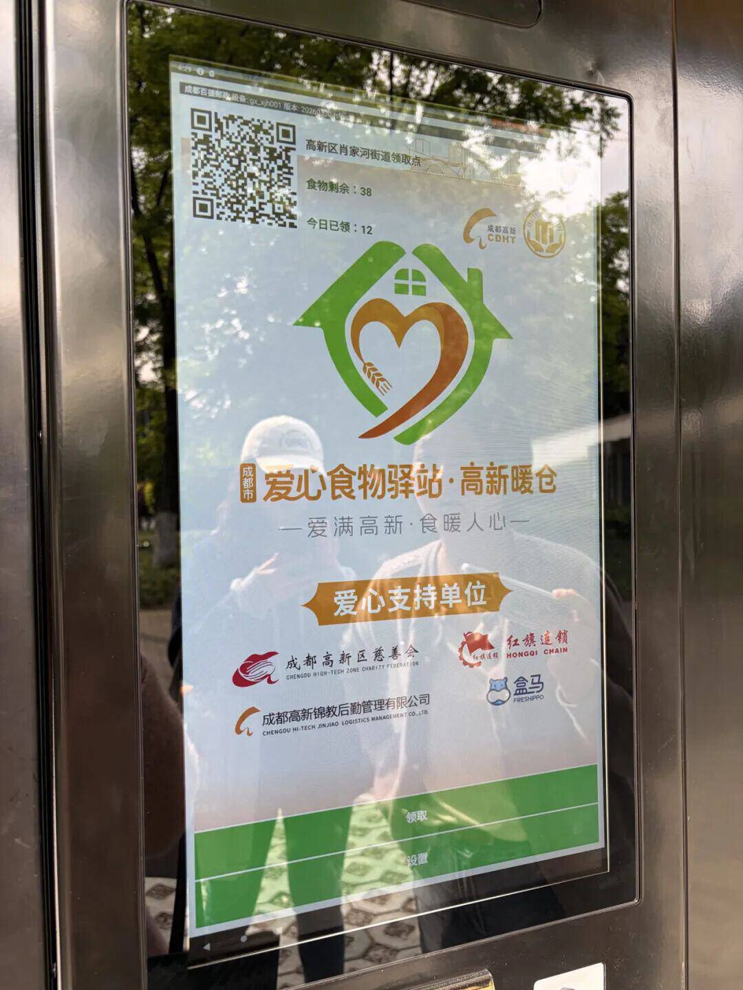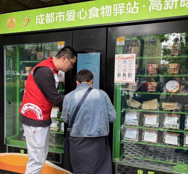 这台醒目的绿色柜子并非普通自助售货机,而是成都市首批投入运营的爱心食物驿站。在这里,特定人群可以免费领取由爱心商家捐赠的余量食物,普通市民也能在特定时段参与共享。