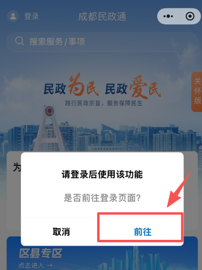 1、微信打开“成都民政通”小程序,按照系统提示完成身份认证和登录。