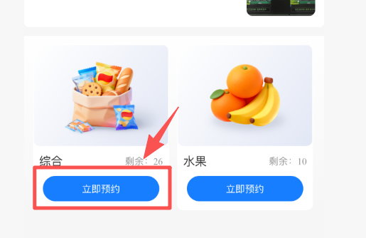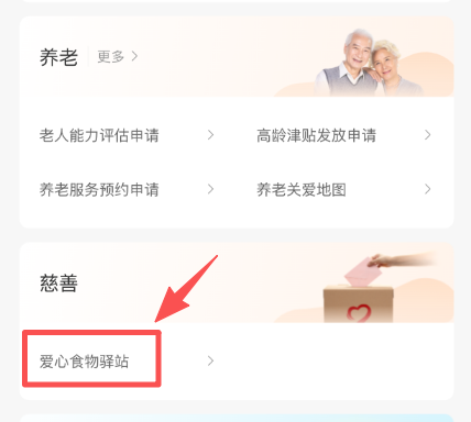 2、在首页找到“慈善”服务板块,点击进入“爱心食物驿站”,选择“食物预约”,查看当前可领取点,选择需要的食物类型提交预约申请。