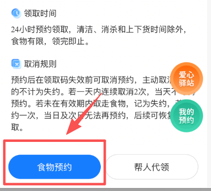 温馨提示:预约后在领取码失效前可取消预约,主动取消预约的不计为失约。若一天内连续取消2次,当天不可再预约。若未在有效期内取走食物,记为失约,若失约一次,当日及次日无法再预约,后续可恢复领取。