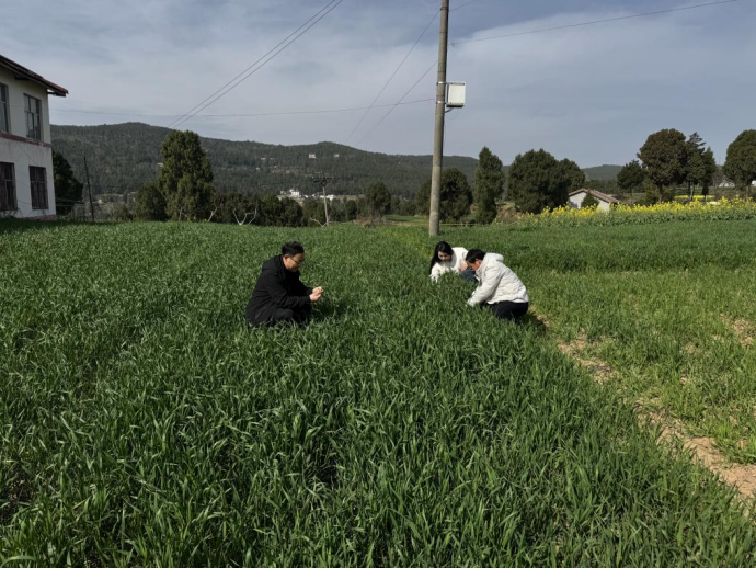 农技干部深入田间地头,查看小麦长势及病虫害情况。