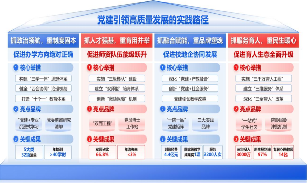 抓人才强基,重育用并举,促进师资队伍能级跃升。深化“引才、留才、稳才”机制创新,实施“人才强校”战略,构建“顶尖人才领航、骨干人才支撑、青年人才储备”三级梯队。以“双百工程”为抓手,引育博士、银龄教师,组建党员博士工作站和行业专家团队,选送骨干教师赴全球前100所高校攻读博士学位。聚焦职业教育特色,建立“双师型”教师“校企双聘、岗课双练”培育体系,与120家龙头企业共建教师实践基地。创新激励保障机制,推行“六险两金+专项补贴”福利体系,设立“教学成果奖”“科研创新奖”等激励项目,教职工年流失率低于3%,构建起政治过硬、业务精湛的高素质师资队伍。