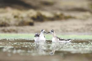 那是2011年9月12日,中秋节,他和3个朋友相约去锦江南瓜滩观鸟。上午11点,他们抵达时,水面上漂着数十只大大小小的水鸟,他一眼就看见污水处理厂的出水口附近,有几只陌生的鸟儿在水面上飞来飞去寻找食物,特征有点像在《动物世界》里看到过的瓣蹼鹬。其中一只陌生的水鸟与一只青脚鹬一起踱上浅水滩涂啄食,它颈项上淡红的印记隐约可辨。李明使劲儿把这只鸟的模样记在心里,回去查资料,没错,就是红颈瓣蹼鹬!后来同行者的照片经过专家证实,这是四川省第一次记录到红颈瓣蹼鹬。