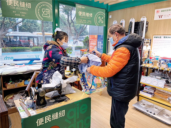 彭聪大姐一天中的大部分时间在“幸福·V帮小站”度过,帮居民换拉链、修改裤脚边等,耐心细致的手艺活,让她赢得了社区居民的认可。“小站虽小,服务却齐全周到。”居民们认为,居住在繁华都市,这样的便民服务点很有必要,不仅收费合理,还能在“家门口”解决“微需求”,很满意。