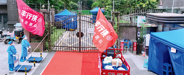 “丰行侠”先锋志愿队前来支援!在圣采·泊尚小区北门,中通快递“小哥”“丰行侠”秦顶树带领的志愿服务小组忙个不停。他们在被划为高风险区的17 栋、18 栋,一天要搬运 1000 多件物资。