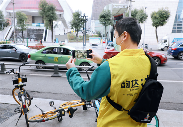成华区快递小哥通过“华仔骑手帮帮团”智慧治理平台上报问题线索。供图 / 成华组