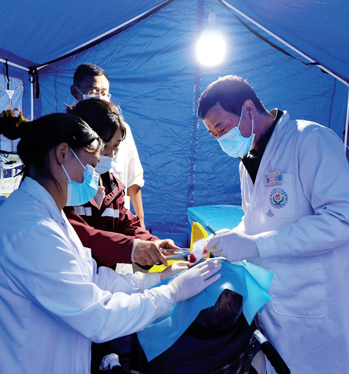 地震发生后,甘孜州康定市第二人民医院外科主任、党员陈兴贵第一时间请缨去抗震救灾一线。包扎、止血、建立静脉通道,为骨折伤者进行外固定术…… 地震当日19 时 23 分,陈兴贵带领康定市医院第一批医疗救援队到达磨西镇后,迅速投入紧张的医疗救治工作中。