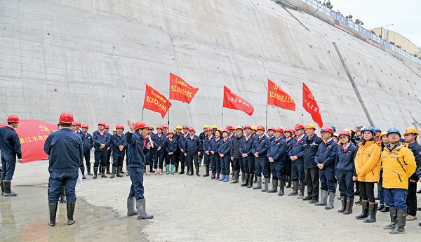 银江水电站导流明渠基坑里的工地微党课。供图 / 川投集团