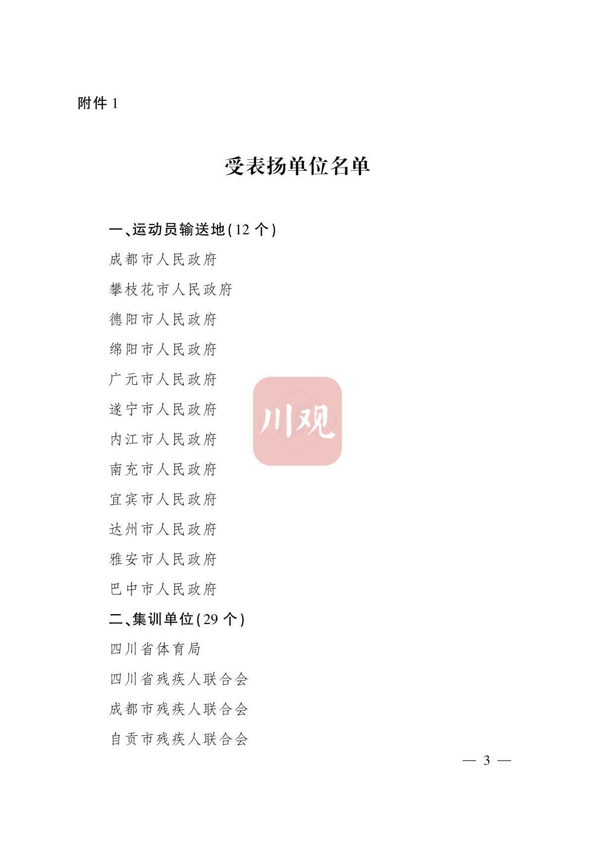 在全国第十一届残疾人运动会暨第八届特殊奥林匹克运动会上,四川体育代表团共夺得71枚金牌、74枚银牌、60枚铜牌,竞技项目金牌数和奖牌数继续位列全国第一方阵,群众体育项目金牌数和奖牌数位列全国第二位,实现了运动成绩和精神文明双丰收。我省残疾人运动员以自强不息、奋勇争先的精神品质和良好竞技水平,为家乡和人民赢得了荣誉。为肯定成绩,激励先进,进一步推动全省残疾人体育事业高质量发展,省政府决定,对在全国第十一届残疾人运动会暨第八届特殊奥林匹克运动会上为我省获得优异成绩作出突出贡献的单位和个人进行通报表扬。