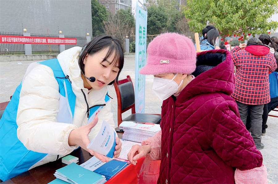 1月11日,德阳市旌阳区孝感街道社会工作服务站社工(左)向社区居民宣传、讲解政策。图/彭圆圆