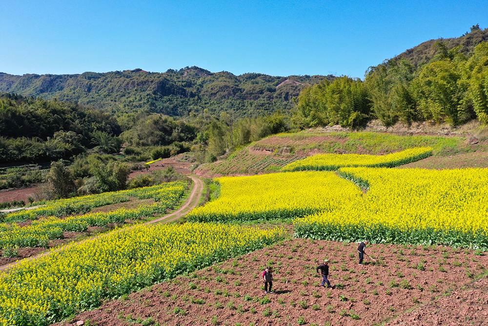 春风送信,油菜花开;春雨寄情,豆苗探头。近日,在泸州市纳溪区打古镇双家村八组——毛乡塝,广袤的田野和蔚蓝的天空宛如画境,村民们在地里翻土、锄草,有序耕耘作业,一幅辛勤实干的乡村图景跃然眼前。