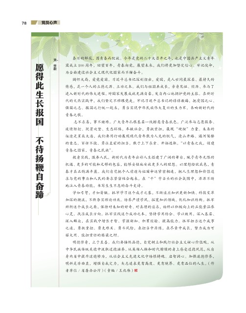 春才真正饱满丰盈。我们自觉把个人前途与祖国命运紧密相连,把人生理想和价值追