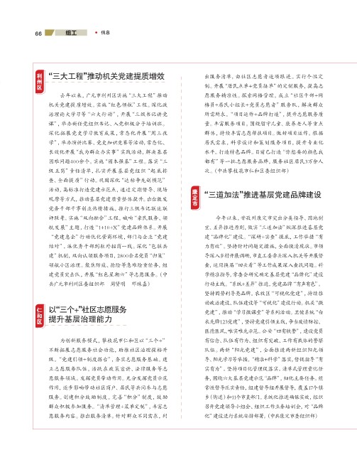 机关党建提质增效。实施“红色领航”工程。深化政 格员+居民小组长+党员志愿者”服务队,解决群众
