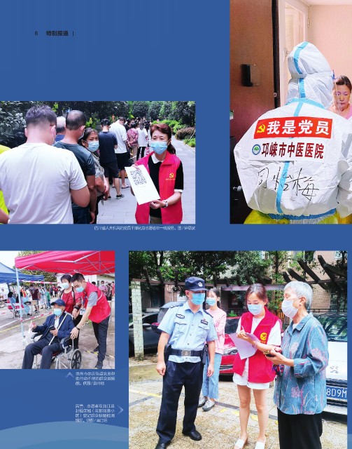 6 特别报道 ● 脱贫攻坚进行时 四川省人大机关的党员干部化身志愿者在一线服务。图 / 钟德波 崇州市崇庆街道党员帮 助行动不便的群众做核 酸。供图 / 崇州组 民警、志愿者在蒲江县 封控区域(花都丽景小 区)登记群众核酸检测 情况。供图 / 蒲江组