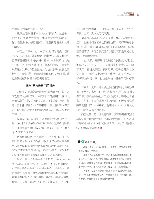 疫情发生以来,夏阳主动申请到一线参与防疫工 战役。在疫情防控一线,四川各级党组织和广大党员