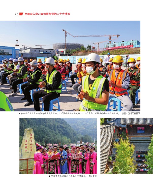 80 全面深入学习宣传贯彻党的二十大精神 在四川天府新区独角兽岛项目建设现场,大家聚精会神收看党的二十大开幕会,现场不时响起热烈的掌声。 供图 / 四川天府新区 绵竹市开展党的二十大报告学习活动。 图/王平