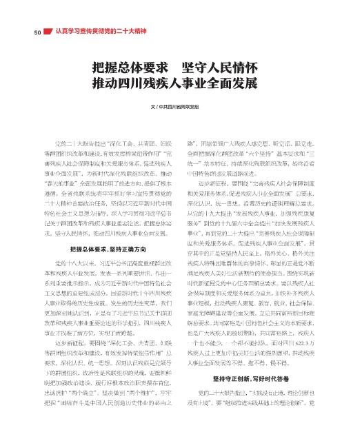求,坚守人民情怀,推动四川残疾人事业全面发展。 事业”,再到党的二十大提出“完善残疾人社会保障制