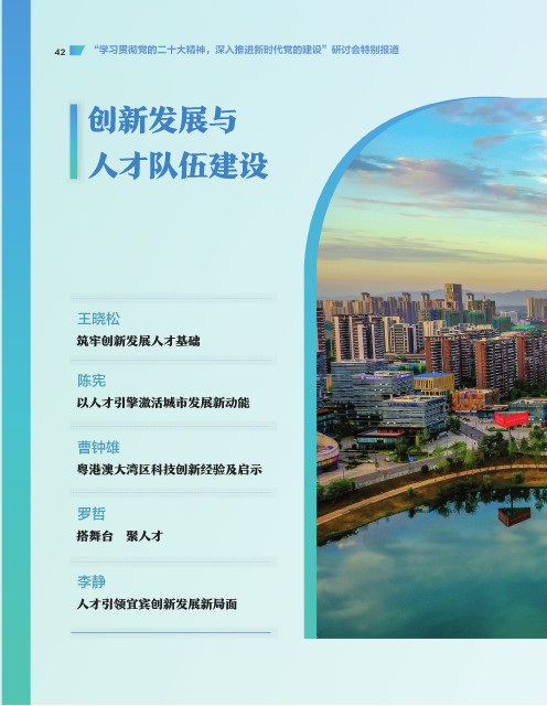 42 “学习贯彻党的二十大精神,深入推进新时代党的建设”研讨会特别报道 创新发展与 人才队伍建设 王晓松 筑牢创新发展人才基础 陈宪 以人才引擎激活城市发展新动能 曹钟雄 粤港澳大湾区科技创新经验及启示 罗哲 搭舞台 聚人才 李静 人才引领宜宾创新发展新局面