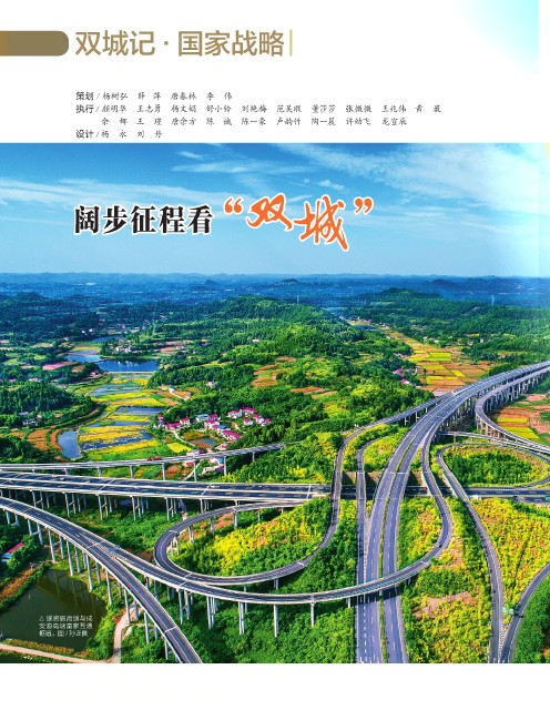 双城记·国家战略 策划 / 杨树弘 薛 萍 唐春林 李 伟 执行 / 颜明华 王志勇 杨文娟 舒小铃 刘艳梅 范吴瑕 董莎莎 张微微 王兆伟 黄 薇 余 娜 王 瑾 唐余方 陈 诚 陈一豪 卢韵竹 陶一晨 许幼飞 龙宣辰 设计 /杨 永 刘 丹 阔步征程看 双 城 ” “ 遂资眉高速与成 安渝高速童家互通 枢纽。图 / 孙正良