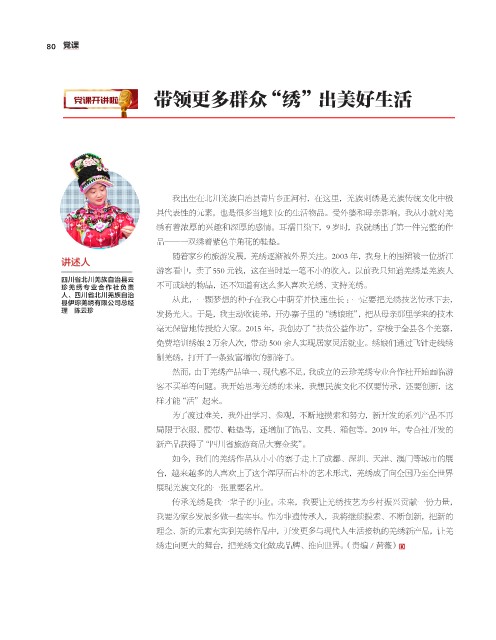 毫无保留地传授给大家。2015 年,我创办了“扶贫公益作坊”,穿梭于全县各个羌寨,