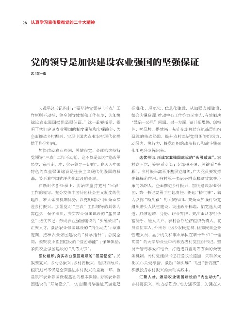 特色的农业强国建设是社会主义现代化强国的根 雁”。乡村振兴离不开基层党组织,广大党员要发挥
