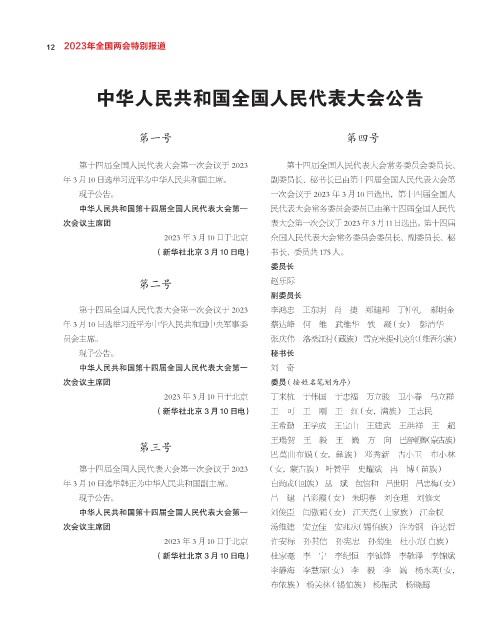 现予公告。 一次会议于 2023 年 3 月 10 日选出,第十四届全国人