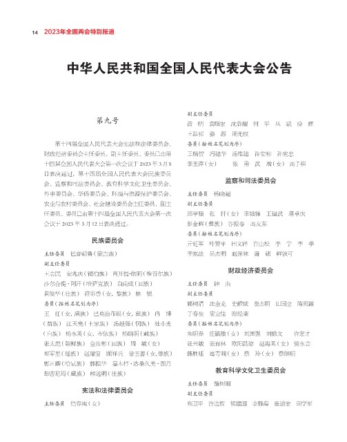 十四届全国人民代表大会第一次会议于 2023 年 3月 5 李玉萍(女) 张 勇 武 增(女) 高子程